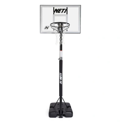 Versatile for All Skill Levels. The NET1 Millennium portable basketball hoop is a versatile choice suitable for various levels of play, from recreational basketball to high-level practice. Its pro-style polycarbonate backboard and spring-loaded rim mimic the bounce of professional-grade hoops like those used in the NBA and BBL, delivering an authentic experience. The offset design of the basket, along with a protective pole pad, ensures safety during play, allowing for direct lay-ups and action beneath the net.. Designed for Both Adults and Kids. The Millennium system offers full adjustability, ranging from the regulation height of 10 feet (3.05m) down to 7 feet 6 inches (2.28m), catering to younger basketball enthusiasts. Changing the height is a breeze – simply remove the pin and slide it into the desired position.. Suitable for All Conditions. Constructed from weather-resistant materials, this system is built to withstand the elements without rusting or sustaining damage. Whether you're playing outdoors on a basketball court, in a playground, or in your garden or driveway, the Millennium hoop can handle it all.. Effortless Installation. Assembling the Millennium hoop at home is a straightforward process, requiring minimal tools. Given its size and stability, it's recommended to have two people for assembly. Once assembled, fill the base with water or sand (sand is preferred for preventing freezing in colder climates).. Highly Portable. The front wheel on the base enhances the system's portability. Simply tilt it back to 45 degrees and roll it to your desired location. While ground anchors are included if you wish to secure the system in one place, they are not necessary for overall stability.