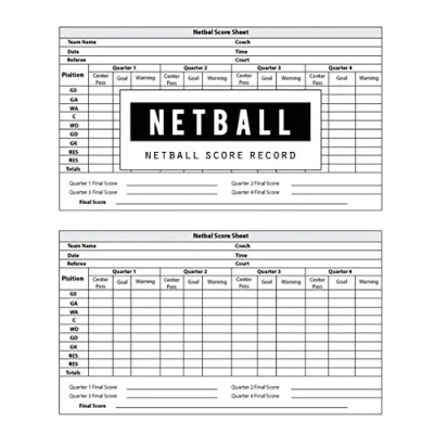 Netball Score Record: Game Record Keeper Book, Sheet Covers Four Quarters, Passes, Goals and Warnings, 8.5 x 11 Inch, Size 100 Pages