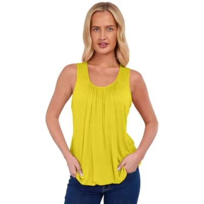 NetSetUK Women Bubble Hem Straps Vest Top Sleeveless Round Pleated Scoop Neckline Summer Ladies Loose Fit Elasticated Camisole Swing Waist Yellow