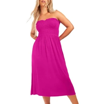 NetSetUK Women's Strapless Sheering Boob Tube Gather Oversized Plus Size Elasticated Bust Bandeau Plain Beach Summer Sleeveless Top Midi Dress for Ladies 8 22 Fuchsia