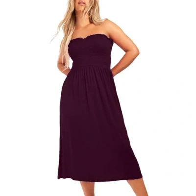 NetSetUK Women's Strapless Sheering Boob Tube Gather Oversized Plus Size Elasticated Bust Bandeau Plain Beach Summer Sleeveless Top Midi Dress for Ladies 8 27 Wine