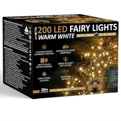 CHRISTMAS FAIRY LIGHTS: Let your home shine brighter with this set of NETTA LED Warm White Christmas Fairy Lights that feature 200 beaming bulbs. These lustrous lights are sure to add a sparkle to your home or a glimmer to your garden over the festive season by enhancing the traditional Christmas theme. Not only are they perfect for Christmas, but they are ideal for any outdoor gathering or for serving a desirable decoration for weddings, birthday parties and events. 8 HOURS ON TIMER SETTING: The timer function allows your lights to turn automatically when it gets dark. To activate the timer, please hold the power button for 3 seconds until it turns green. You will then be able to select your preferred lighting mode and the lights will remain on for 8 hours and turn off for 16 automatically. To turn off the timer, please hold the power button for 3 seconds until it turns white. 8 FUNCTIONS WITH MEMORY: This set of multifunctional string lights features 8 lighting modes to choose from, including Combination, Steady On, Slow Fade, In Waves, Slow Glow, Chasing/Flash, Sequential and Twinkle/Flash. The different lighting effects are controlled by a button on the battery pack which make it easier than ever to achieve your desired lighting effects. The bulbs are set 10cm apart to ensure that you get a full festive glow over this Christmas period. SAFE FOR INDOOR AND OUTDOOR USE: Running off 3 x AA batteries, these lights can be used indoor or outdoor due to the waterproof, low voltage battery pack. The lights have a lit length of 20M and the cable length is 50cm which ensures easy installation. 365-DAY WARRANTY: We hope that you love these lights, but on the off-chance that you don't, NETTA provides a full 365-day warranty on this product. If you are not completely satisfied with this item, please don't hesitate to contact our customer service department.