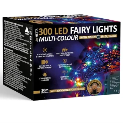 CHRISTMAS FAIRY LIGHTS: Let your home shine brighter with this set of NETTA LED Multi-Coloured Christmas Fairy Lights that feature 300 beaming bulbs. These lustrous lights are sure to add a sparkle to your home or a glimmer to your garden over the festive season by enhancing the traditional Christmas theme. Not only are they perfect for Christmas, but they are ideal for any outdoor gathering or for serving a desirable decoration for weddings, birthday parties and events. 8 HOURS ON TIMER SETTING: The timer function allows your lights to turn automatically when it gets dark. To activate the timer, please hold the power button for 3 seconds until it turns green. You will then be able to select your preferred lighting mode and the lights will remain on for 8 hours and turn off for 16 automatically. To turn off the timer, please hold the power button for 3 seconds until it turns white. 8 FUNCTIONS WITH MEMORY: This set of multifunctional string lights features 8 lighting modes to choose from, including Combination, Steady On, Slow Fade, In Waves, Slow Glow, Chasing/Flash, Sequential and Twinkle/Flash. The different lighting effects are controlled by a button on the battery pack which make it easier than ever to achieve your desired lighting effects. The bulbs are set 10cm apart to ensure that you get a full festive glow over this Christmas period. SAFE FOR INDOOR AND OUTDOOR USE: Running off 3 x AA batteries, these lights can be used indoor or outdoor due to the waterproof, low voltage battery pack. The lights have a lit length of 30M and the cable length is 50cm which ensures easy installation. 365-DAY WARRANTY: We hope that you love these lights, but on the off-chance that you don't, NETTA provides a full 365-day warranty on this product. If you are not completely satisfied with this item, please don't hesitate to contact our customer service department.