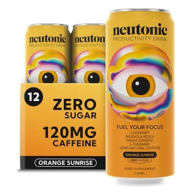 JoybuyNeutonic Productivity Energy Drinks Orange Sunrise (12 x 330ml) is a sugar-free, low-calorie energy drink formulated to enhance focus and attention with nootropic ingredients, including 500mg Cognizin, L-Theanine, Rhodiola, and B vitamins—developed by James Smith and Chris Williamson for peak productivity.
