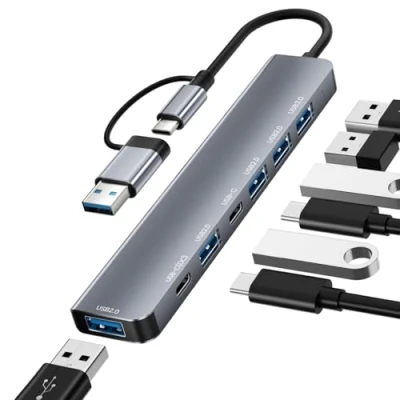 【Powerful 7 in 1 】USB C Hub has 4 USB A 2.0 ports, 2 USB C ports and 1 USB 3.0 port. Multi USB can connect multiple devices such as keyboard, mouse and card reader, making it a versatile and useful device for those who need to connect multiple devices 【2 in 1 Dual Adapter】Multi USB port A dual 2 in 1 adapter design, supports USB and USB-C ports and can be easily connected to a variety of tablets, laptops, smartphones and other devices without the need to use other connectable adapters 【High-quality materials】Mini USB C hub has built-in high-quality chips to ensure the stability and reliability of the docking station. At the same time, usb duplicator adopts high quality aluminum alloy shell, which has good thermal insulation effect and longer service life 【Plug and Play, Safe and Stable】USB hub requires no additional operating method, does not need to install drivers, programs or software and can be directly connected to your laptop, tablet or mobile phone and other devices. At the same time, the laptop docking stations use advanced built-in chips to better fit your device's USB-C interface, thus achieving stable signal transmission and ensuring stable file transfer Universal compatibility: Multi-port USB C adapter is compatible with a wide range of USB-C compatible devices. The usb c dock is compatible with iPhone/Galaxy/Huawei/Xiaomi/MacBook Pro Air/Galaxy Tab, compatible with mouse, keyboard, hard drive etc other devices. The usb c ethernet hub is also compatible with Mac OS/Windows/Linux/Android multiple systems