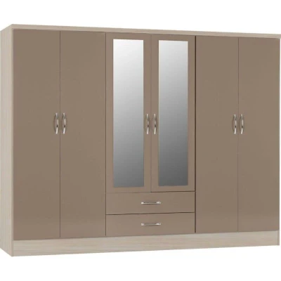 Nevada 6 Door 2 Drawer Mirrored Wardrobe L52 x W230 H182.5 cm Oyster Gloss/Light Oak Effect Veneer