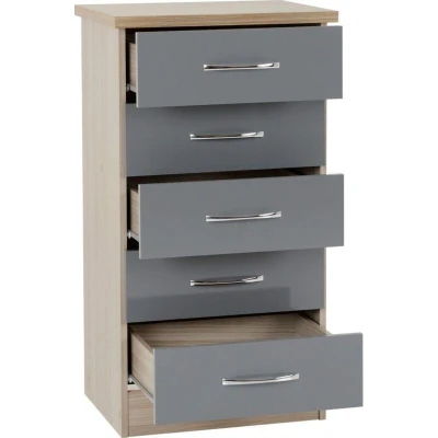 Nevada Chest Of Drawers 5 Drawer Narrow With Metal Handles Storage Unit (Grey Gloss/Light Oak Effect Veneer)