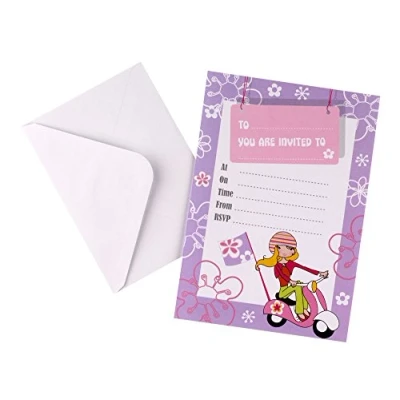 Pack of 10 invitation including envelopes Plenty of space to write your party details Can be co-ordinated with other pieces in the Scooter Girls range