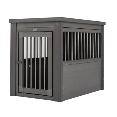 Elegant way to house your pet while disguising the pet crate as a fashionable piece of furniture that can double as an end table Made of ECOFLEX, a non-toxic recycled plastic-wood polymer composite material that won't warp, crack or split Spindles made of stainless steel tubing and a stainless steel latch; double latches on large and x-large crates Easy, no-tools assembly For dogs up to 20lbs Exterior Dimension: 23.8 in. L x 18.1 in. W x 22 in. H || Interior Dimension: 20.9 in. L x 15 in. W x 17.9 in. H Door Dimension: 11 in. W x 16.8 in. H Removable table top for easy cleaning. Requires no maintenance Crates can provide a safe secure hangout space for your dog. Best used for dogs that are crate trained and that do not have anxiety. ECOFLEX does not absorb moisture, therefore stains and odors are a thing of the past