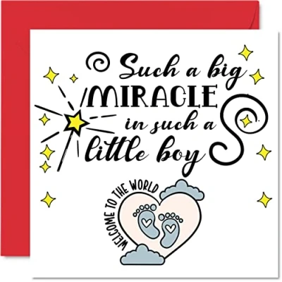 MAKE THEM SMILE WITH THIS CONGRATULATIONS BABY BOY CARD: This exceptional quality just passed card for her or him shows the design "Such a big miracle in such a little boy". If you are looking for awesome congratulations greetings cards for men or women, then then this baby boy cards newborn 2022 is bound to make them smile. Not just a its a boy card for him or her this could also be for a new baby cards boy for Friend, Work Colleague, Brother, Sister, Uncle, Auntie or Family. WHAT DO YOU GET: The card is printed on one side and BLANK ON THE INSIDE to allow you to write your very own message. The unique fun design is printed on a specially sourced and environmentally responsible board. At 360 microns thick the natural white one-sided gloss board has a quality look and feel. Supplied with a coloured gummed envelope to complement the design and ready to be sealed and sent in the post. NO INK SMUDGES: There is nothing worse than writing inside a card to find that the shiny surface makes the ink smudge. This is why we use a high quality one sided coated board. The uncoated side will absorb more of the ink from your pen to make smudging a thing of the past. SIZES: Greeting Card = 145mm x 145mm, Envelope = 155mm x 155mm, Card Thickness = 360 micron. Great birth of baby boy card. Congratulations cards, congratulation card, new baby boy cards, the new boy card, grandparents cards for new baby boy, baby boy cards congratulations, new baby boy gift. MADE AND QUALITY CHECKED IN THE UK: We print and manufacture all our product right her in the UK so you can be sure of a fast turnaround and a product that is expertly made. Using environmentally responsible premium board our card is conscious of the responsible management of the world's forests - milestone baby cards, congratulations newborn card, birth cards for baby boy.