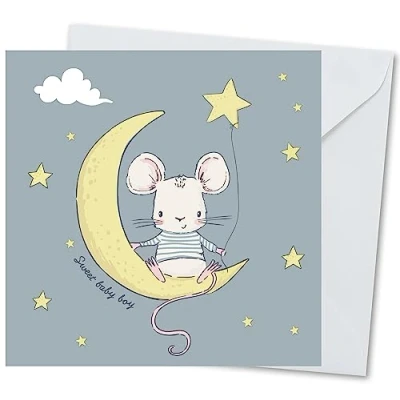 New Baby Boy Card. Birthday Card with Matching Envelope. Moon & Mouse design. size 148x148mm. Eco friendly. Message inside. Printed and Packed in UK.