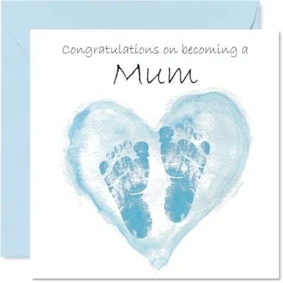 MAKE THEM SMILE WITH THIS CUTE NEW BABY BOY CARD: This exceptional quality Daughter new baby card for Mum shows the design 'Congratulations On Becoming A Mum'. If you are looking for a unique new baby card for Mum, then then this happy new baby card is bound to make them smile. Not just a new baby boy card for Mum this could also be a new baby boy gifts for Mum, Mummy or Mother. WHAT DO YOU GET: The card is printed on one side and BLANK ON THE INSIDE to allow you to write your very own message. The unique fun design is printed on a specially sourced and environmentally responsible board. At 360 microns thick the natural white one-sided gloss board has a quality look and feel. Supplied with a coloured gummed envelope to complement the design and ready to be sealed and sent in the post. Great Mum new baby cards, Mummy new baby card, Mother new baby card. NO INK SMUDGES: There is nothing worse than writing inside a card to find that the shiny surface makes the ink smudge. This is why we use a high quality one sided coated board. The uncoated side will absorb more of the ink from your pen to make smudging a thing of the past. new baby cards for new Mother, new baby card for new Mum, new baby cards for new Mummy. SIZES: Greeting Card = 145mm x 145mm, Envelope = 155mm x 155mm, Card Thickness = 360 micron. New Mum baby card, new baby boy cards for Mummy, unique new baby boy cards for Mother, Mum new baby boy card, Mummy new baby boy card. MADE AND QUALITY CHECKED IN THE UK: We print and manufacture all our products right here in the UK so you can be sure of a fast turnaround and a product that is expertly made. Using environmentally responsible premium board our card is conscious of the responsible management of the world's forests - perfect new baby cards for Mum, cute new baby cards boy, Mummy baby cards, boy baby cards.
