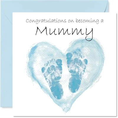 MAKE THEM SMILE WITH THIS CUTE NEW BABY BOY CARD: This exceptional quality Daughter new baby card for Mummy shows the design 'Congratulations On Becoming A Mummy'. If you are looking for a unique new baby card for Mummy, then then this happy new baby card is bound to make them smile. Not just a new baby boy card for Mummy this could also be a new baby boy gifts for Mummy, Mum or Mother. WHAT DO YOU GET: The card is printed on one side and BLANK ON THE INSIDE to allow you to write your very own message. The unique fun design is printed on a specially sourced and environmentally responsible board. At 360 microns thick the natural white one-sided gloss board has a quality look and feel. Supplied with a coloured gummed envelope to complement the design and ready to be sealed and sent in the post. Great Mummy new baby cards, Mum new baby card, Mother new baby card. NO INK SMUDGES: There is nothing worse than writing inside a card to find that the shiny surface makes the ink smudge. This is why we use a high quality one sided coated board. The uncoated side will absorb more of the ink from your pen to make smudging a thing of the past. new baby cards for new Mother, new baby card for new Mummy, new baby cards for new Mum. SIZES: Greeting Card = 145mm x 145mm, Envelope = 155mm x 155mm, Card Thickness = 360 micron. New Mummy baby card, new baby boy cards for Mum, unique new baby boy cards for Mother, Mummy new baby boy card, Mum new baby boy card. MADE AND QUALITY CHECKED IN THE UK: We print and manufacture all our products right here in the UK so you can be sure of a fast turnaround and a product that is expertly made. Using environmentally responsible premium board our card is conscious of the responsible management of the world's forests - perfect new baby cards for Mummy, cute new baby cards boy, Mum baby cards, boy baby cards.