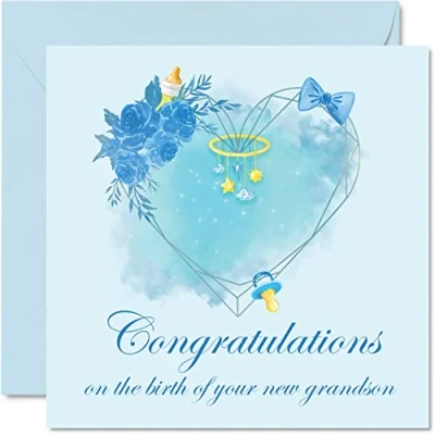 MAKE THEM SMILE WITH THIS CONGRATULATIONS BABY BOY CARD: This exceptional quality just passed card for her or him shows the design "Congratulations on the birth of your new grandson". If you are looking for awesome congratulations greetings cards for men or women, then then this baby boy cards newborn 2022 is bound to make them smile. Not just a its a boy card for him or her this could also be for a new baby cards boy for Friend, Work Colleague, Brother, Sister, Uncle, Auntie or Family. WHAT DO YOU GET: The card is printed on one side and BLANK ON THE INSIDE to allow you to write your very own message. The unique fun design is printed on a specially sourced and environmentally responsible board. At 360 microns thick the natural white one-sided gloss board has a quality look and feel. Supplied with a coloured gummed envelope to complement the design and ready to be sealed and sent in the post. NO INK SMUDGES: There is nothing worse than writing inside a card to find that the shiny surface makes the ink smudge. This is why we use a high quality one sided coated board. The uncoated side will absorb more of the ink from your pen to make smudging a thing of the past. SIZES: Greeting Card = 145mm x 145mm, Envelope = 155mm x 155mm, Card Thickness = 360 micron. Great birth of baby boy card. Congratulations cards, congratulation card, new baby boy cards, the new boy card, grandparents cards for new baby boy, baby boy cards congratulations, new baby boy gift. MADE AND QUALITY CHECKED IN THE UK: We print and manufacture all our product right her in the UK so you can be sure of a fast turnaround and a product that is expertly made. Using environmentally responsible premium board our card is conscious of the responsible management of the world's forests - milestone baby cards, congratulations newborn card, birth cards for baby boy.