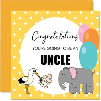 MAKE THEM SMILE WITH THIS CONGRATULATIONS BABY CARD: This exceptional quality card for her or him shows the design "Congratulations You’re going to be a Uncle". If you are looking for awesome congratulations greetings cards for women, then then this baby unisex cards newborn 2022 is bound to make them smile. Not just a its a baby card for him or her this could also be for a new baby cards boy or girl for Friend, Work Colleague, Brother, Sister, Uncle, Auntie or Family. WHAT DO YOU GET: The card is printed on one side and BLANK ON THE INSIDE to allow you to write your very own message. The unique fun design is printed on a specially sourced and environmentally responsible board. At 360 microns thick the natural white one-sided gloss board has a quality look and feel. Supplied with a coloured gummed envelope to complement the design and ready to be sealed and sent in the post. NO INK SMUDGES: There is nothing worse than writing inside a card to find that the shiny surface makes the ink smudge. This is why we use a high quality one sided coated board. The uncoated side will absorb more of the ink from your pen to make smudging a thing of the past, baby shower card, baby boy cards newborn, baby girl cards newborn 2022, baby shower cards for parents. SIZES: Greeting Card = 145mm x 145mm, Envelope = 155mm x 155mm, Card Thickness = 360 micron. Great birth of baby card. Congratulations cards, congratulation card, new baby boy cards, new baby girl cards, the new baby card, grandparents cards for new baby, baby cards congratulations, new baby gift, congratulations baby girl card, congratulations baby boy card. MADE AND QUALITY CHECKED IN THE UK: We print and manufacture all our product right her in the UK so you can be sure of a fast turnaround and a product that is expertly made. Using environmentally responsible premium board our card is conscious of the responsible management of the world's forests - milestone baby cards, congratulations newborn card, birth cards for baby.