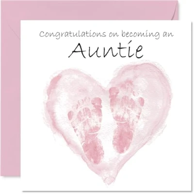 MAKE THEM SMILE WITH THIS CUTE NEW BABY GIRL CARD: This exceptional quality Niece new baby card for Auntie shows the design 'Congratulations On Becoming An Auntie'. If you are looking for a unique new baby card for Auntie, then then this happy new baby card is bound to make them smile. Not just a new baby Girl card for Auntie this could also be a new baby Girl gifts for Auntie, Aunt or Aunty. WHAT DO YOU GET: The card is printed on one side and BLANK ON THE INSIDE to allow you to write your very own message. The unique fun design is printed on a specially sourced and environmentally responsible board. At 360 microns thick the natural white one-sided gloss board has a quality look and feel. Supplied with a coloured gummed envelope to complement the design and ready to be sealed and sent in the post. Great Auntie new baby cards, Aunt new baby card, Aunty new baby card. NO INK SMUDGES: There is nothing worse than writing inside a card to find that the shiny surface makes the ink smudge. This is why we use a high quality one sided coated board. The uncoated side will absorb more of the ink from your pen to make smudging a thing of the past. new baby cards for new Aunty, new baby card for new Auntie, new baby cards for new Aunt. SIZES: Greeting Card = 145mm x 145mm, Envelope = 155mm x 155mm, Card Thickness = 360 micron. New Auntie baby card, new baby Girl cards for Aunt, unique new baby Girl cards for Aunty, Auntie new baby Girl card, Aunt new baby Girl card. MADE AND QUALITY CHECKED IN THE UK: We print and manufacture all our products right here in the UK so you can be sure of a fast turnaround and a product that is expertly made. Using environmentally responsible premium board our card is conscious of the responsible management of the world's forests - perfect new baby cards for Auntie, cute new baby cards Girl, Aunt baby cards, Girl baby cards.