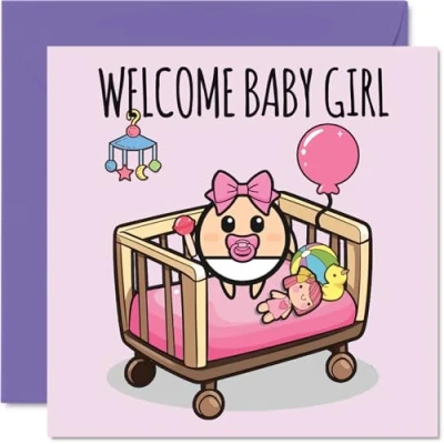 MAKE THEM SMILE WITH THIS WELCOME BABY GIRL CARD: This exceptional quality congratulations on your newborn baby card shows a cute baby girl with the words "Welcome Baby Girl". If you are looking for heartfelt congratulations greetings cards for parents, then then this newborn baby girl card is bound to make them smile. This could be for Friend, Work Colleague, Brother, Sister, Uncle, Auntie or Family. WHAT DO YOU GET: The cards are printed on both sides with the inside print showcasing a cute verse and ample space for your own personal message. The unique fun design is printed on a specially sourced and environmentally responsible board. At 360 microns thick, the natural white one-sided gloss board has a quality look and feel. Supplied with a coloured gummed envelope to complement the design and ready to be sealed and sent in the post. NO INK SMUDGES: There is nothing worse than writing inside a card to find that the shiny surface makes the ink smudge. This is why we use a high quality one sided coated board. The uncoated side will absorb more of the ink from your pen to make smudging a thing of the past. SIZES: Greeting Card = 145mm x 145mm, Envelope = 155mm x 155mm, Card Thickness = 360 micron. Great birth of baby girl card. Congratulations cards, congratulation card, new baby girl cards, the new girl card, grandparents cards for new baby boy, baby girl cards congratulations, new girl gift. MADE AND QUALITY CHECKED IN THE UK: We print and manufacture all our product right her in the UK so you can be sure of a fast turnaround and a product that is expertly made. Using environmentally responsible premium board our card is conscious of the responsible management of the world's forests - milestone baby cards, congratulations newborn card, birth cards for baby girl.
