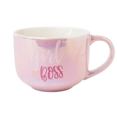 New Bone China Soup Mug with Decal 500ml Boss Lady Quote Ceramic Coffee Cup Pastel Colours Gift for Women Students, Co Workers (H 7cm x W 10.5cm) Assorted (Pink)
