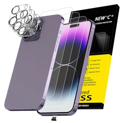 WARNING: Not compatible with iPhone 14, iPhone 14 Pro, iPhone 14 Plus Content: 3 Tempered Glass Screen Protectors, 3 Camera Lens Protectors for iPhone 14 Pro Max (6.7 inches) and a dust plug. Double front and back protection for the phone. Made of premium high-quality tempered glass with a thickness of 0.33 mm and rounded edges. An ideal anti-break solution: Extremely high hardness, protects the phone screen from shocks and accidental damage. Oleophobic: it has an oleophobic coating that prevents fingerprints and other contaminants, making the film easy to clean. Dust-free, no fingerprints, a push-button too easy, bubble-free installation. NEW'C Tempered Glass Screen Protector for iPhone 14 Pro Max (6.7 inches). Preserved touch sensitivity: a silicone adhesive coating that makes installation easy and durable while preserving the phone's touch qualities.