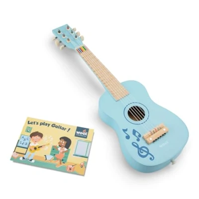 This wooden pretend toy guitar from New Classic Toys is the perfect toy instrument for your child. When your little one takes to the stage with their new toy guitar, you know you’ll be ready to witness a show unlike any other. Comes complete with a color-coded music book featuring 3 songs to help children play their first tunes. It has 6 nylon strings and it includes a spare string and a comfort-fit shoulder strap. This imitation toy is suitable from 3 years old., Manufacturer: New Classic Toys