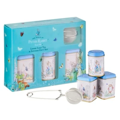 Elegant tea gift set featuring 3 loose leaf blends: English Breakfast, Earl Grey, and Afternoon Tea Includes a stainless steel tea infuser for convenient brewing of loose leaf tea at home or on the go Each collectible tin is decorated with Peter Rabbit illustrations for a classic English charm Perfect for tea lovers, birthdays, Mother’s Day, anniversaries, or thoughtful year-round gifting Presented in a decorative gift box, making it a ready-to-give present with timeless appeal
