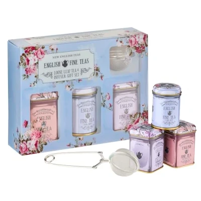 Elegant tea gift set featuring 3 loose leaf blends: English Breakfast, Earl Grey, and Afternoon Tea Includes a stainless steel tea infuser for convenient brewing of loose leaf tea at home or on the go Each collectible tin is decorated with vintage floral illustrations for a classic English charm Perfect for tea lovers, birthdays, Mother’s Day, anniversaries, or thoughtful year-round gifting Presented in a decorative gift box, making it a ready-to-give present with timeless appeal
