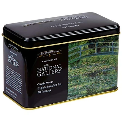 A decorative rectangular tea tin (14cm x 9cm x 7cm) with hinged lid and includes 40 teabags Includes 40 English Breakfast teabags, foil-wrapped for freshness Sourced from the highland region of Ceylon with a robust yet smooth and calming flavour Decorated with Monet's 'The Water Lily Pond' painting, in collaboration with The National Gallery Makes a great gift for art enthusiasts and more available from New English Teas
