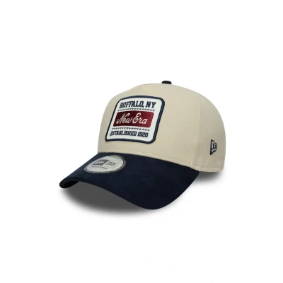 New Era Patch Suede Cream 9FORTY E-Frame Adjustable Cap New Era Heritage Script logo patch on front New Era Heritage Script woven tab on rear New Era Flag embroidered on left Structured E-Frame crown Leather strapback with New Era branded metal hinge clasp Curved navy faux suede visor Navy undervisor POLYESTER, COTTON Product ID: 60771797