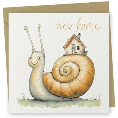 New Home Card. Snail Design. Textured Card with Kraft Envelope. 150x150mm when folded. Message inside. Made in Britain.