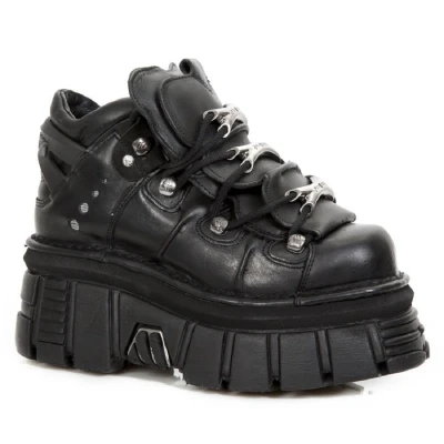 This style of leather ankle boots has become synonymous with the New Rock name and all the quality and style that New Rock is internationally acclaimed for. A distinct metal motif is imbued upon these shoes with additions such as New Rock branded adornments at the laces, metallic detailing inserted in the sole and metallic brand engravings that feature at the heel, all contributing to a stylish gothic theme. For a bold and contemporary edge, the gum rubber heel and sole are raised to a height of 7cm and 5cm respectively, which gives these boots a standout authority that will give you an eye-catching presence. As always New Rock follows through on its reputation for perfection and has excelled in its provision of quality, style, and comfort for this pair of boots.• Heel Height - 7cm• Platform Height - 5cm• Shaft Height - 10cm• Black Laces with metal adornments• Sole Material - Natural Rubber• Outer Material - Cow Hide Leather