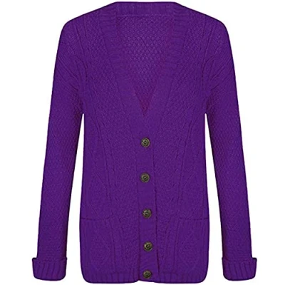 New Womens Everyday Long Sleeve Button Top Ladies Chunky Aran Cable Knit Grandad Cardigan (12 14, Purple)