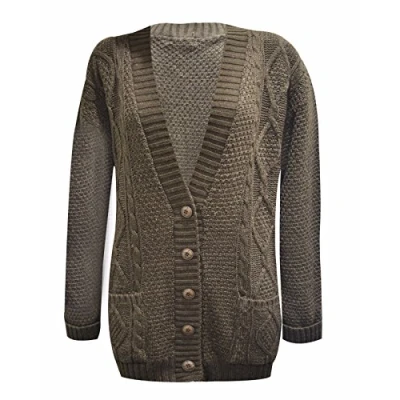 New Womens Everyday Long Sleeve Button Top Ladies Chunky Aran Cable Knit Grandad Cardigan Dark Brown Size 12 14