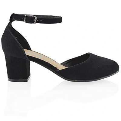 New Womens Low Mid Block Heel Ankle Strap Bucklke Ladies Sandals Court Shoes 8 UK Black Faux Suede