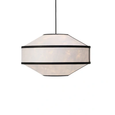The Kite 1B Pendant Light Ø55 White/Black from New Works is an elegant addition to your home that combines modern design with functionality. This pendant light is part of a series that explores proportion and abstraction through a harmonious blend of geometric shapes and textured materiality. Made from folded Tyvek sheets glued to polythene sheets, the Kite pendant light ensures both stability and a light expression. The opal white and black colour combination provides a timeless aesthetic, while the cast metal fittings add a touch of robustness. With a diameter of 55 cm, this pendant light is ideal for creating a sculptural luminous element in any room, whether it's the living room, dining room or entrance hall. The delicate edge bands emphasise the lamp's silhouette and add depth and contrast, making it an eye-catching piece in your interior design.