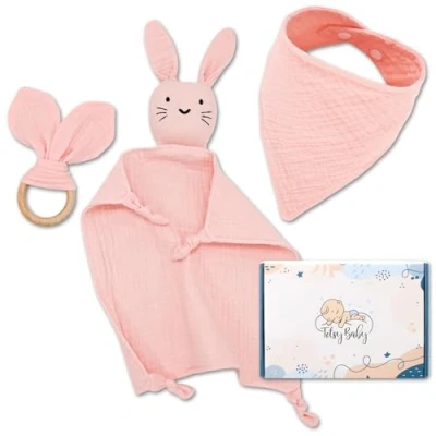 🌿 [NATURAL MATERIALS] – All parts of the baby shower gift set are made from high-quality muslin materials that are gentle on the baby's delicate skin. The newborn baby set remains soft even after many washes. 💖 [COMFORT FOR BABIES] – The soft cuddly cloth baby 'Bunny' (27x27 cm) fits perfectly in small children's hands. The baby comfort blanket provides warmth and comfort. Ideal for cuddling, sleeping, and playing! 👶 [PRACTICAL BIB] – The bib from the birth gift for girls and boys (42x18x27 cm) with adjustable closure reliably protects against drooling, keeps clothes clean and dry, and ensures dry and clean baby clothes. 🦷 [SAFE TEETHER] – The teether from the newborn baby set made of wood with a diameter of 7 cm helps with teething, relieves pain, and has no sharp edges, making it safe for the baby. 🛏️ [SUPPORT FOR SLEEP] – The cuddle cloth from the birth gift supports a calm and restful sleep. Baby shower gift provides comfort and is ideal for babies who need a sense of security. 🎁[IDEAL FOR ON THE GO] – With practical, compact dimensions, the baby girl and boy gift set is easy to transport. Baby items for newborns are perfect for on the go and as a gift set for new parents or at a baby shower. Packaged in a stylish box.