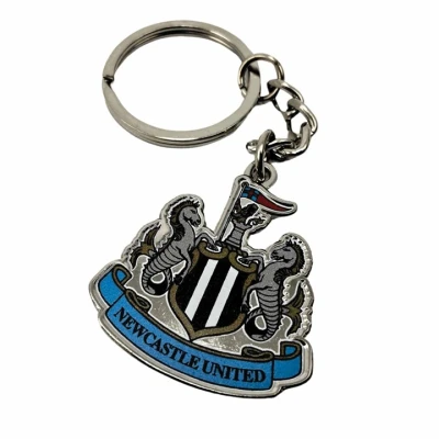 Newcastle United FC Crest Keyring. Metal crest shaped keyring with chain and split ring. Die stamped design with full colour infill. Metal alloy with silver style finish. Official licensed product. Size: Approx 35mm x 35mm | Packaging: On a header card