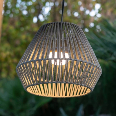 Can be hung anywhere outdoors: Conta rechargeable LED hanging light The Conta rechargeable LED light consists of a recycled PVC lampshade that can be hung anywhere using a cord (not included), a permanently installed LED light source and a rechargeable battery. A USB port is also built in so that a charging cable with plug-in power supply (not included) can be connected. Conta can hang from the branch of a tree, for example, or from the beams of a pergola. It provides warm white light for a cosy atmosphere. Conta is supplied with a portable LED bulb that does not need to be installed. It adheres thanks to its magnetic base and can be switched on and off and dimmed using the remote control included.