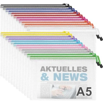 Package Includes: 24 PCS Zipper plastic wallets in 12 colors. 2 plastic wallets per color. The different colors can help you sort different files. and the quantity is enough for your daily office study and storage use. Size: The plastic zip wallets are in A5 size. Zip A5 wallets is about 23 x 17CM/9 x 6.7inch. A5 paper and document can be easily put into the bag. Premium Materials: Our zipper document bags are made of high-quality PVC, waterproof, tear-resistant and reusable, thicker than regular mesh bags, which can effectively prevent ash and moisture, and better protect the items you store. Mesh structure, sturdy and stable. Good Design: These zip lock bags are transparent enough that you can see at a glance what's inside, The smooth and durable zipper makes it easy to open and carry, helping you find documents easily. Wide Application: Our plastic zip wallets are suitable for sorting cosmetics, books, notebooks, tickets, invoices, scattered gadgets, etc. Make sure your home is neat and organized. To avoid important items missing or losing. Perfect for office workers, doctors, teachers, students, etc. Ideal as gifts, office supplies, school rewards, class prizes, etc.