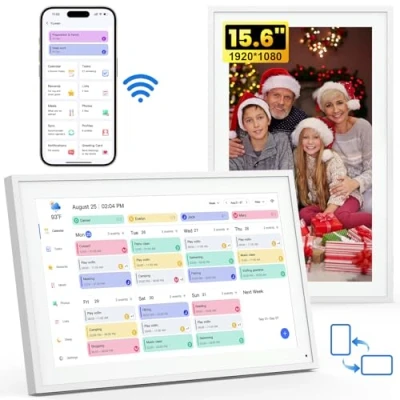 All-in-one family calendar: 15.6-inch(39.5*25*2.5cm) Full HD display (1920 x 1080) + eCalendar app with digital calendar. Easily plan and synchronise appointments, activities, meals and reminders for all family members. (All app features are available without subscription) Simple and flexible organisation: supports 2.4G/5G Wi-Fi, multiple accounts and touch control. Quickly edit directly on the device or via the app. Use this digital diary to keep track of everyone's schedules and better organise your personal life. Powerful family planner: this digital calendar not only offers planning features, but also goals and activities, goal rewards, to-do lists, meal planning, e-cards and family albums. Create a positive atmosphere and precious memories for your family with this family calendar. Perfect for commuters and parents: this digital calendar helps you organise family activities and learning plans for children and motivate them with rewards. No more daily reminders: your digital diary will bring more order and efficiency to your family's daily life. Compatible with popular calendars: synchronised with Google, iCloud, Outlook, Cozi and Yahoo! Calendars. Use this desk calendar or planner as the perfect digital diary to ensure maximum flexibility for your daily life. Local and cloud storage – 32 GB of internal memory + cloud backup to securely store family plans, household tasks and important memories. Smart calendar for everyday use: automatic brightness adjustment, energy-saving mode and screen rotation for flexible use on the wall or on your desk.