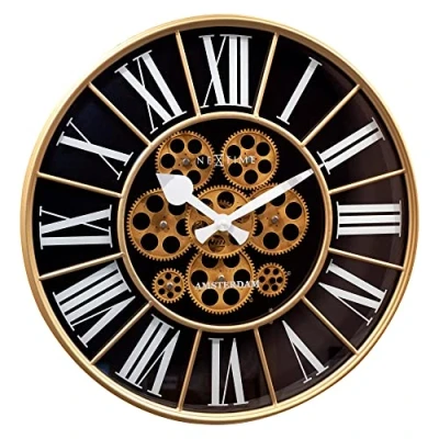 Large Wall Clock 50 cm Real moving gears Bold Roman Index Glass lens Metal case This NeXtime "William" wall clock is designed with stunning moving gears. The style and the size of it (Ø 50cm) makes this clock a real centrepiece The off white colour roman index (printed on the glass lens) and the same colour hands give a clear contrast with the black dial behind that makes it very easy to read time from a distance The moving gears are separately controlled from the clock and can be easily switched off. This clock runs on 3x AA battery (not included)