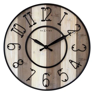 This NeXtime "Oxford" wall clock (Ø 50cm) radiates farmhouse elegance with robust details; the double metal rings make the clock stand out further This clock has a beautiful light brown and off white linear pattern on the dial, and a set of classic black hands. Each clock face is unique reflecting the grain of the wood it was made from The bold metal index allows you to read time with ease, even across the room. This clock is silent and runs on 1x AA battery (not included)