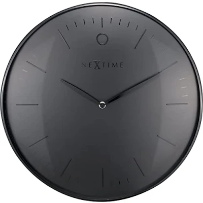 The designer wall clock GLAMOUR by NeXtime looks very elegant due to the curved glass front and the black metal frame. Large wall clock in minimalistic design with dark grey dial and black hour and minute hands The dimensions of the round wall clock are ø 40 cm x 4.5 cm No annoying ticking thanks to the very silent quartz movement, required batteries 1 x 1.5 V AA (not included) Designed by NeXtime. Dutch design with an international touch has created some of the most internationally recognised and award-winning clock designs over the years.