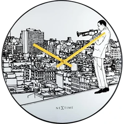 The NeXtime "Trumpet City" is a wall clock (40 cm diameter) designed by Tim Schoonhoven The dial is made of glass and has a slim elegant metal edge This clock has yellow hands and shows an image of a man playing trumpet with a city view for a touch of jazz in your room he clock is silent and runs on 1x AA battery (not included).