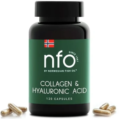 NFO Collagen & Hyaluronic Acid — This is a powerful complex of easily digestible fish collagen (collagen peptides), hyaluronic acid, vitamins and minerals for healthy skin, hair, nails, teeth, bones, cartilage and a number of other beneficial benefits for beauty and health! A certified product with a high standard: NFO Collagen & Hyaluronic Acid has been manufactured in a factory that has been rated and classified as compliant with the requirements of the Food Safety System Certification 22000 (Food Safety System Certification 22000 / FSSC 22000) Effects of the complex of NFO collagen and hyaluronic acid ingredients for daily use (according to the reports of the Commission Regulation (EU)) No. 1: health of bones, nails, teeth, gums, skin, cartilage, mucous membranes and their healing processes; muscle work; cogns. itive functions of the brain s; Concentration: learning, memory, thinking, mental performance; nervous system; psycho-emotional state; protection of body tissues and cells from oxidative damage - antioxidant activity; immune system during training; eye health and protection against oxidative and photooxidative stress: health of the retina, health of the lens Effects of complex no. 2: maintenance of vision; reduces fatigue and fatigue; health, structure and function of blood vessels; biosynthesis of carnitine; energy metabolism; absorption of iron from food; regulation of the body during inflammatory processes; regeneration of the antioxidant form of vitamin E; absorption and use of calcium; balance of calcium concentration in the blood; absorption. and use of Phosphor; the process of cell division; macronutrient metabolism; fatty acid metabolism; vitamin A metabolism; energy metabolism; DNA synthesis; acid base metabolism; carbohydrate metabolism; fertility protein synthesis testosterone balance in the blood Recommendations for use and composition: for women and men, 1-4 collagen capsules high dose once a day with meals or as recommended by your doctor. One capsule contains: collagen powder (hydrolysed collagen from fish) 250 mg, hyaluronic acid 10 mg, vitamin C (L-ascorbic acid) 40 mg, biotin (vitamin B7 (H), D-biotin) 100 μg, zinc (zinc citrate) 3.75 mg, capsule (hydroxypropyl methylcellulose, G). ellanggummy, ellang). There are 120 capsules in one jar. Each capsule contains collagen powder. Suitable for sports and fitness. The ideal dietary supplement for your health New quality of life – made in Norway. High-tech production. This product is manufactured in an ISO, GMP registered unit. Improve your health and body and feel the love of nature with our ultra-complex supplements that help you maintain a healthy eating style WADA and GMO-FREE - The NFO products do not contain toxic, potent, synthetic drugs, psychotropic drugs and doping ingredients in the list of WADA 2021, GMO (genetically modified or modified (transgenic) organisms / plants), pesticides, hormones, as well as nanotechnologically produced nanoparticles and ingredients