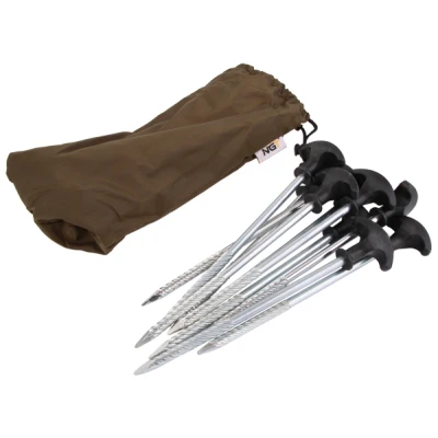 NGT Bivvy Pegs - Set of 10 robust bivvy pegs - Length: 20cm - Including practical carry bag - Spiral-shaped screw wire - Easy to put into any surface - Perfectly designed handle - Very robust - Quick and easy The spiral-shaped screw wire make these pegs perfect for any type of surface, even when the surface is extemely hard! The special shape of the rubber head allows you to easily pull them out of the ground when you finish your fishing session.