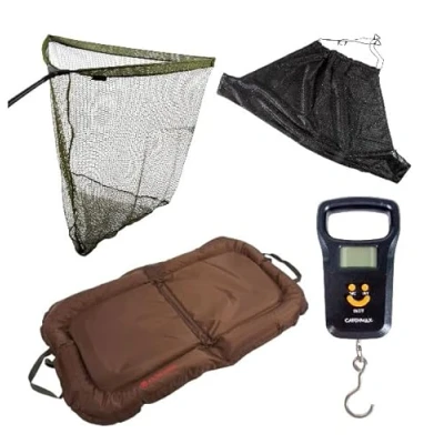 Complete Carp Landing & Weigh Set The following is included in the deal: - Ultimate Adventure 36" Tele Carp Net - Ultimate Session Unhooking Mat - Catchmax Digital Scale 50kg - Catchmax Allround Sling A complete set to safely land, unhook and weigh your catch! Fish safety is always the number one priority and you can now confidently land your catch knowing the fish won’t be harmed. You will receive a large landing net with telescopic handle. The unhooking mat allows you to safely unhook your catch wile weighing your catch can be done with the All Round Sling and the scale of up to 50 kg! Specifications: Ultimate Adventure Carp Net Inc. Tele Handle - Carp landing net - Available in several sizes - 36" arms - Includes telescopic handle - Sturdy plastic spreader block - Length of handle: 102-180cm - Equipped with fine, fish-friendly mesh - Mesh with reinforced stitching - Super lightweight - Perfect for carp, pike and other large fish Ultimate Session Unhooking Mat - Dimensions: 110 × 70cm - Foldable - Transport dimensions: 57 × 70cm - Weight: 2kg - Equipped with handles - Easy to take with you - Quick drying material - Easy to keep clean - Safe and easy to unhook your catch - Very fish friendly - An excellent mat for a great price! Catchmax Digital Scale - Digital scale - Capacity: up to 50kg - Clear LCD screen - Also readable in daylight - Taring possible - Display in kg or lb - Equipped with ergonomic handle - Sturdy weighing hooks - Batteries included - Easy to take to the waterfront Catchmax Allround Sling - Dimensions: 110×50cm - Weighing bag - Dries quickly - Lightweight - Mesh material - Easy to use