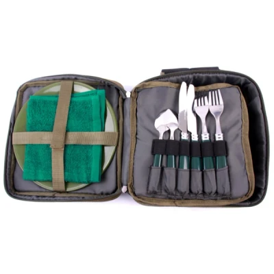 Complete Cutlery Set for 2 People including Carry Case - Deluxe Carry Case (23×10×23cm) - 2 knives - 2 forks - 2 spoons - 2 thermal mugs - 2 jars for spices - 2 plates - 1 green towel Super practical for all carp fishermen or everyone who likes to spend time near the water! This set contains cutlery for 2 people and comes in a deluxe carry case that easily fits into every carryall. The set consists of 2 green plates, 2 forks, 2 knives, 2 spoons, 2 thermal mugs, 2 jars for spices and a green towel.