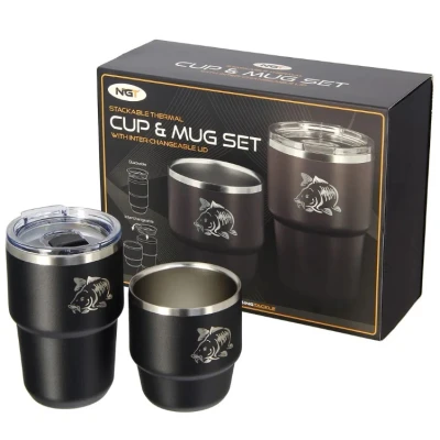 NGT Twin Mug Set Stackable Outdoor Drink Set - Compact thermo drink set for anglers - Contents: 180ml cup and 240ml mug - Outer wall: 201 stainless steel - Inner wall: 304 stainless steel - Optimal insulation - Stylish design with carp logo - Interchangeable transparent lid - Keeps drinks hot or cold for hours - Double-walled stainless steel construction - Ideal for travel, fishing trips or everyday use - Suitable for both hot coffee and cold beverages The NGT Twin Mug Set is a stackable thermo drink set, consisting of a 180ml mug and a 240ml mug, made of double-walled stainless steel (exterior 201, interior 304) for optimal insulation. The set has a stylish design with carp logo, interchangeable transparent lid and keeps drinks hot or cold for hours. Compact and ideal for fishing trips, travel or daily use, suitable for both hot coffee and cold drinks.
