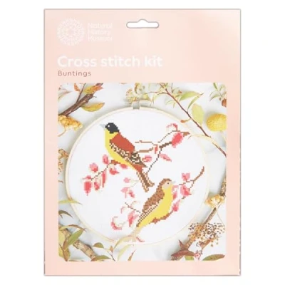 NHM Natural History Museum Cross Stitch Kit, Buntings Design, 14cm Embroidery Kits for Adults, Adults Beginners, Gift Idea, with Patterns, Set