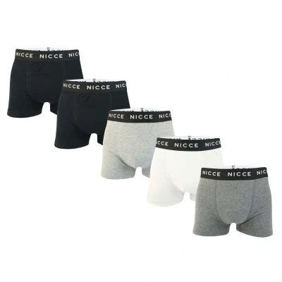 Mens NICCE Haunton 5 Pack Boxer Shorts in black grey white.- NICCE signature elastic waistband.- 5 pack.- Stretch cotton comfort fabric.- 95% Cotton 5% Elastane.- Ref: NCHAUNTON
